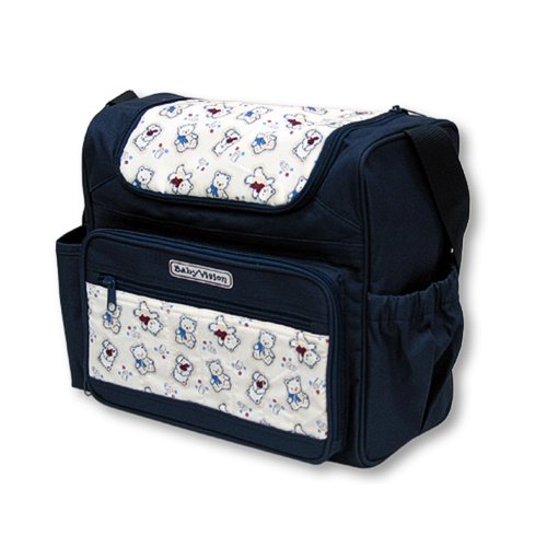 Diaper bag features a compact design that is ideal for day and weekend trips. The large zippered pocket provides for easy access to essentials. A front organizer and side pockets make for easy organizing on the go. Fully lined waterproof interior. Elasticized bottle holders and light insulation. Adjustable shoulder strap for added comfort. Includes vinyl changing pad. Available in navy with Americana bear print.