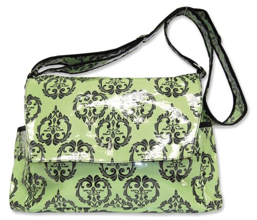 This modern black and sage print is 100% cotton twill covered with a clear PVC overlay. There are two bottle pockets on the outside of the bag and a wide back pocket. Inside are a large mesh divider, one zippered pocket, plus one additional pocket. A removable, matching changing pad is also included. Features a 28" - 48" adjustable strap. 14"L x 4"W x 12"H